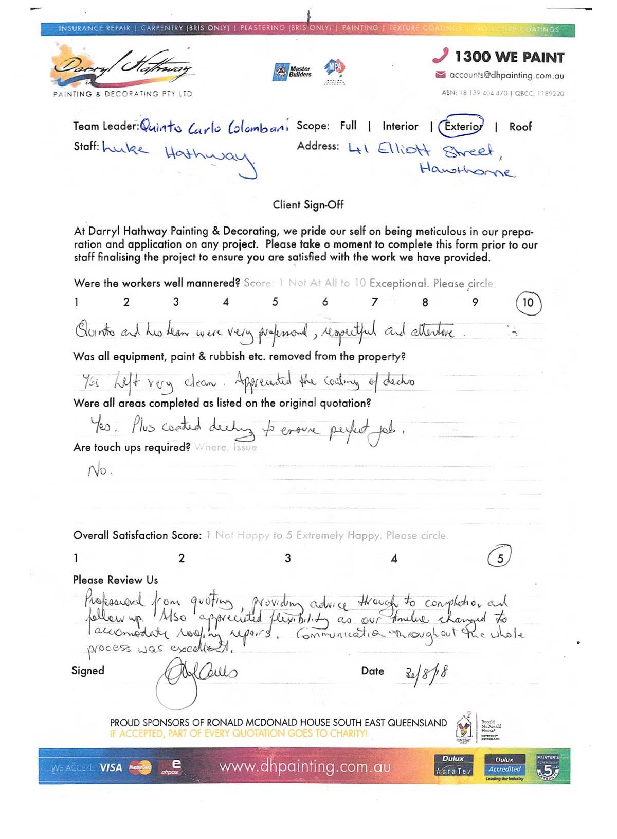 Professional from quoting, providing advice through to completion and follow up. Also appreciated flexibility as our timeline changed to accommodate roofing repairs. Communication throughout the whole process was excellent.